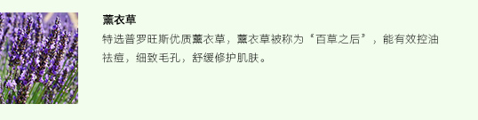 精选普罗旺斯上等薰衣草,新鲜采摘蒸馏而成,完整保留了其珍贵成分。良好的渗透力,使薰衣草精华被肌肤充分吸吮,日复一日,逐步改善肌肤状态,锁住肌肤水分,让多余油脂无处藏匿。同时有效收敛粗大的毛孔,令肌肤细致清透会呼吸。 薰衣草充满魔力的香气,净化、安抚你的心灵,带给你宁静的同时而又吐露着可爱俏皮的小情调。
