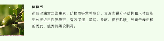 荷荷巴油和人体皮脂的组分接近,亲肤性强,易被肌肤吸收,使肌肤柔软有弹性。同时还可用于护发,改善粗糙的秀发,使秀发柔顺轻盈。