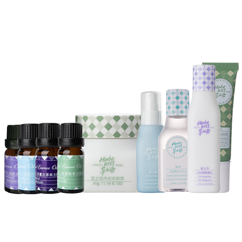 产品明细:30ml欧石楠舒缓修护敏肌精,150ml薄荷控油醒肤花卉水,100ml薰衣草毛孔细致收敛水,15g绿茶清颜祛痘急救啫喱,30ml绿茶痘后修护菁华液,50g草之语净痘清颜霜,10ml草之语茶树单方精油,10ml草之语薰衣草单方精油,10ml草之语蓝甘菊精油,10ml草之语快乐鼠尾草精油